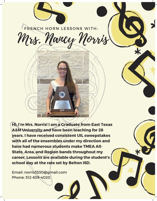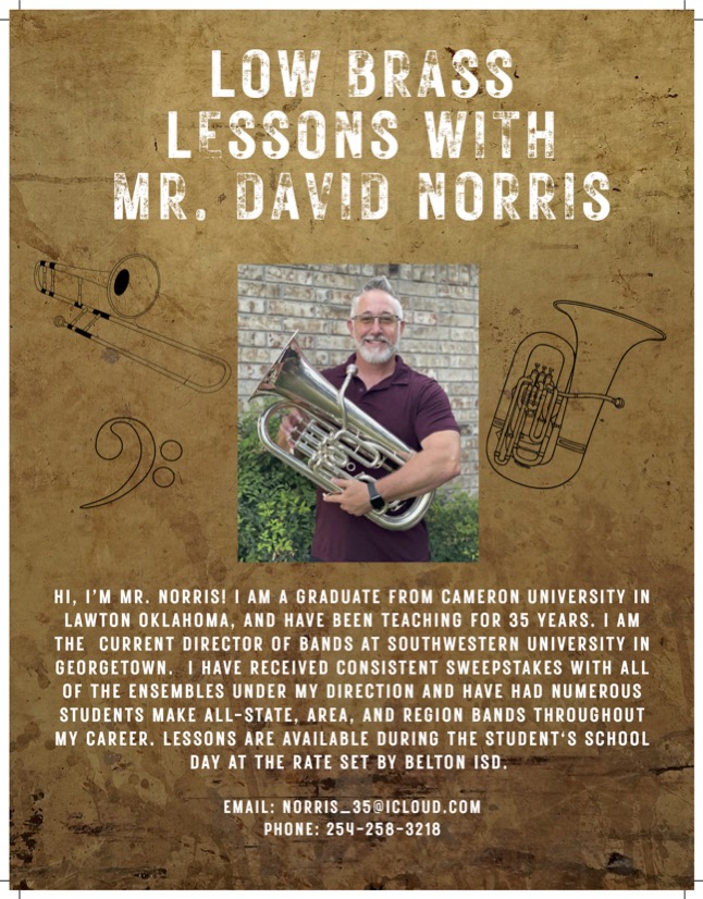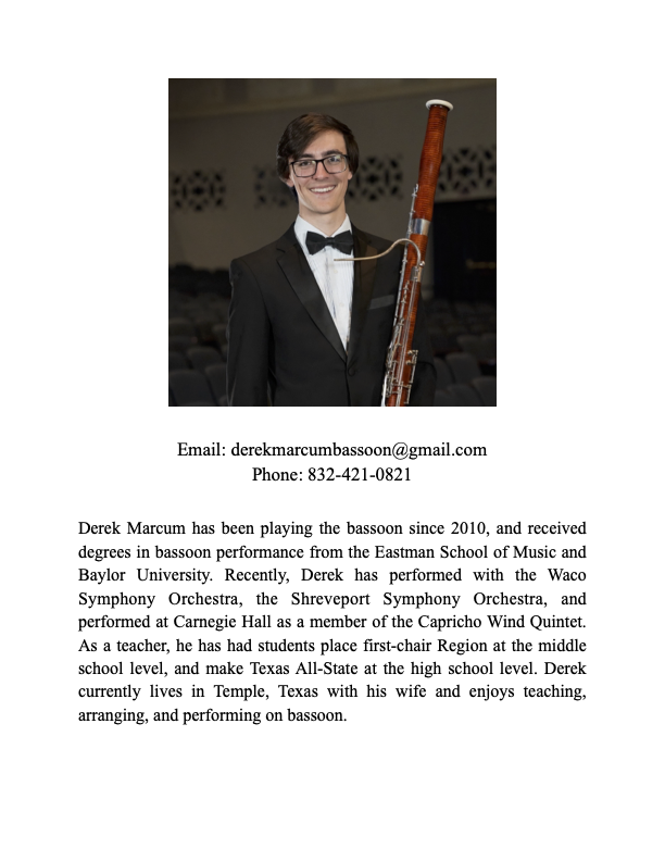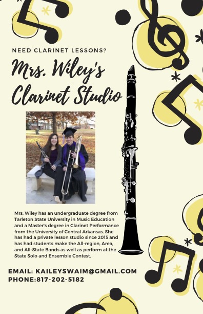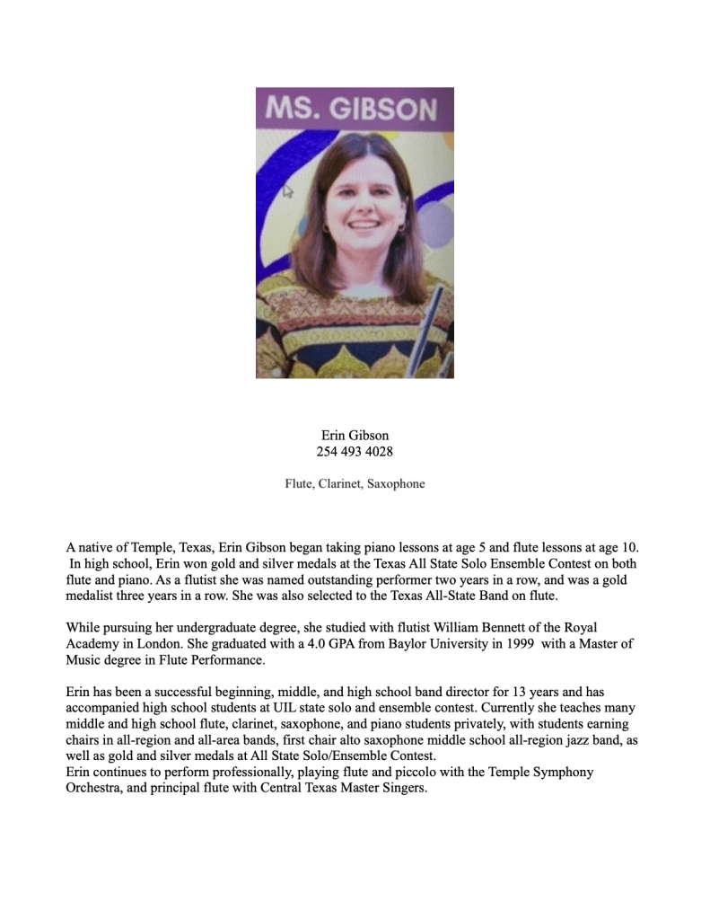 Kaylenn Henderson holds a bachelor’s in Music education from McMurry University. She taught all level band for 14 years. In 2016 Kaylenn began teaching private clarinet and saxophone lessons for Belton ISD. Her students have had major success in the band program with most of her beginning students making the top band at their school their 7th grade year. She has two children involved in the Belton Band programs, and thus does not have time to be in any ensembles herself. She enjoys teaching and seeing her students hit their musical goals!