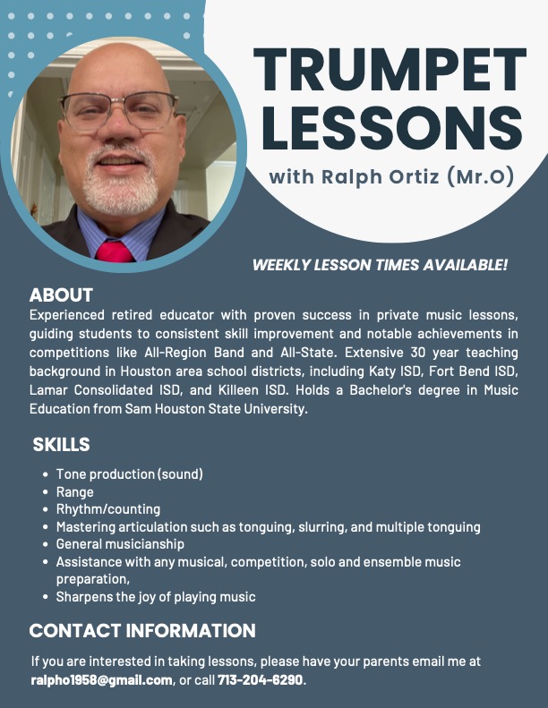Private lessons are $1 per minute. A typical lesson is 25 minutes for a total cost of $25 per lesson. Contact a lesson teacher or band director for more details.